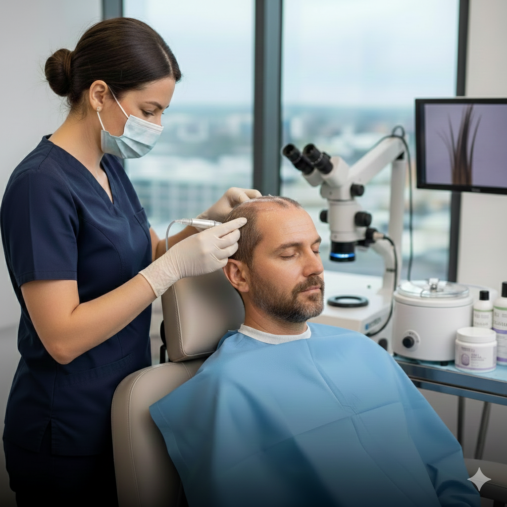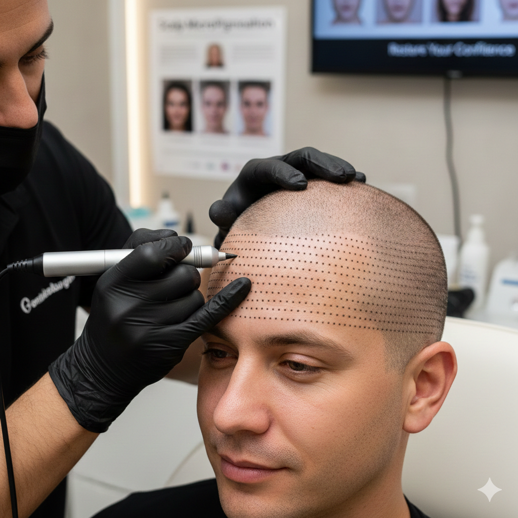 Description: The modern ‘Gold Standard’ of hair restoration. We use high-precision Sapphire blades to create micro-channels, ensuring higher density and faster healing than traditional methods.